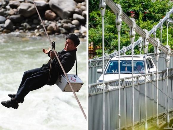 拼版照片:左圖為2011年2月20日,“溜索醫(yī)生”鄧前堆在怒江州福貢縣石月亮鄉(xiāng)拉馬底村溜索到江對(duì)岸出診(新華社記者秦晴攝)。右圖為2022年9月14日,鄧前堆出診歸來駕駛私家車過橋(新華社記者江文耀攝)。