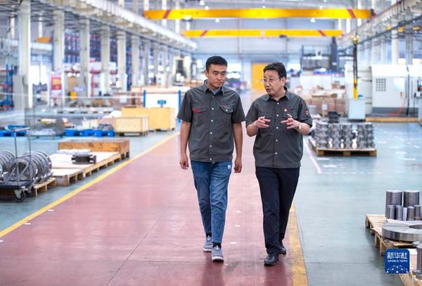 在位于寧夏吳忠市的吳忠儀表有限責(zé)任公司自動(dòng)化產(chǎn)業(yè)園數(shù)字化裝配車間內(nèi),馬玉山(右)與技術(shù)人員交流(9月12日攝)。 新華社記者 楊植森 攝