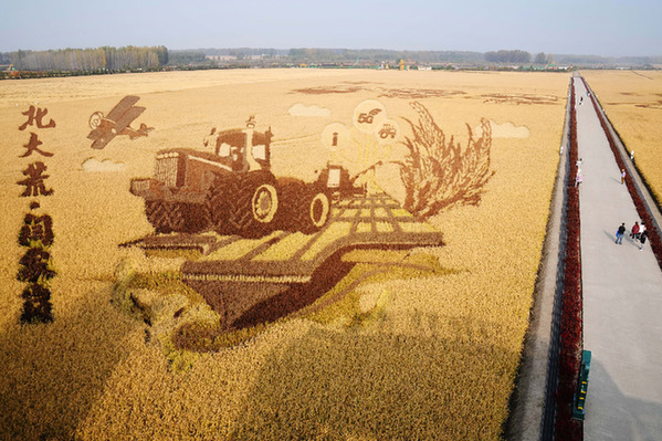 人們在北大荒集團(tuán)閆家崗農(nóng)場有限公司農(nóng)業(yè)現(xiàn)代化示范區(qū)的稻田畫旁游玩。新華社記者 王建威 攝