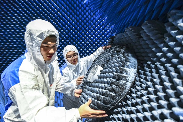 在寧波曙翔新材料股份有限公司實(shí)驗(yàn)室內(nèi),研發(fā)人員對(duì)航天產(chǎn)品進(jìn)行數(shù)據(jù)測試。(丁繼敏 攝)
