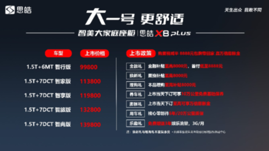 思皓X8 PLUS共5款車型,官方指導(dǎo)價9.98萬元-13.98萬元,并尊享多重大禮:訂車可享受至高8000元金融補貼、至高8000元增換購補貼、核心零部件5年或20萬公里質(zhì)保、3年免費娛樂流量(3G/月)、上市當(dāng)天下訂可享10萬公里免費基礎(chǔ)保養(yǎng)和至高萬倍膨脹金等,誠意十足,讓廣大用戶悅享高品質(zhì)舒適出行。