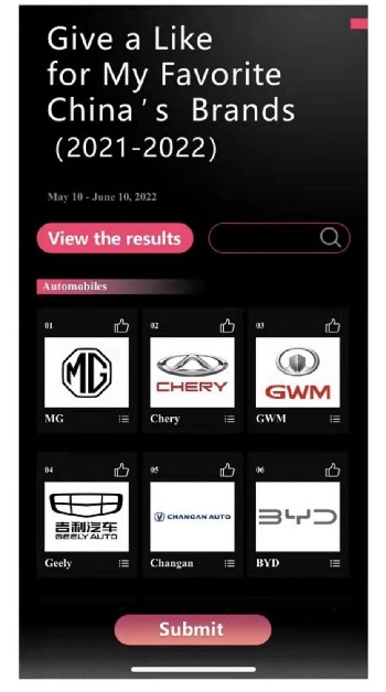 為展示中國品牌在國內(nèi)國際雙循環(huán)相互促進的新發(fā)展格局下的全球化競爭力,新華社民族品牌工程辦公室、中國經(jīng)濟信息社聯(lián)合多家機構(gòu)從2022年3月起共同推出了“2022外國人喜愛的中國品牌”征集活動?;顒油ㄟ^參考主流媒體、行業(yè)協(xié)會、電商平臺、企業(yè)信息平臺、企業(yè)官網(wǎng)信息及《財富》雜志世界500強、中國500強等各類數(shù)據(jù),遴選出涵蓋汽車、家電、醫(yī)藥、酒類、食品飲料、化妝品、服飾鞋帽、電子消費品、金融、交通物流、網(wǎng)絡服務等11類、共137個品牌的初選名單,并于5月10日起面對海外消費者開啟網(wǎng)絡投票。
