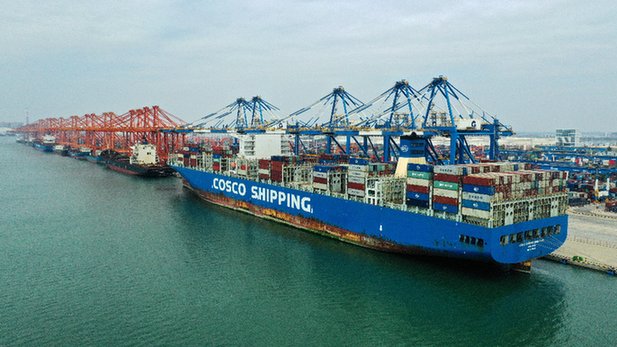 圖為貨輪??吭趶V西欽州港裝卸貨。新華社記者 張愛(ài)林 攝
