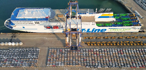 出口商品車在山東港口煙臺(tái)港集結(jié)裝船(無(wú)人機(jī)照片)。