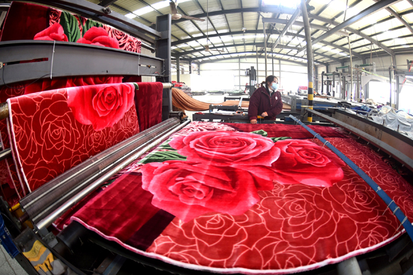 1月3日,工人在江蘇連云港高新區(qū)海州工業(yè)園的一家毛毯企業(yè)忙碌。