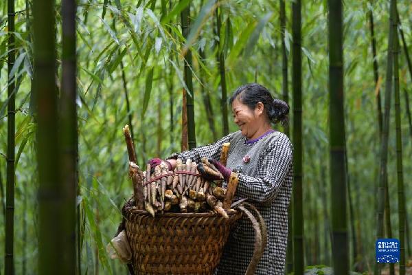 2022年10月27日,在貴州省赤水市寶源鄉(xiāng)聯(lián)華村,農(nóng)民收獲竹筍。新華社記者 楊文斌 攝
