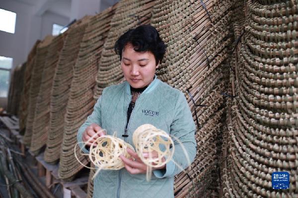2022年11月29日,在貴州省赤水市竹城竹業(yè)加工坊,赤水竹編傳承人唐小容在編織竹制品。新華社記者 劉續(xù) 攝