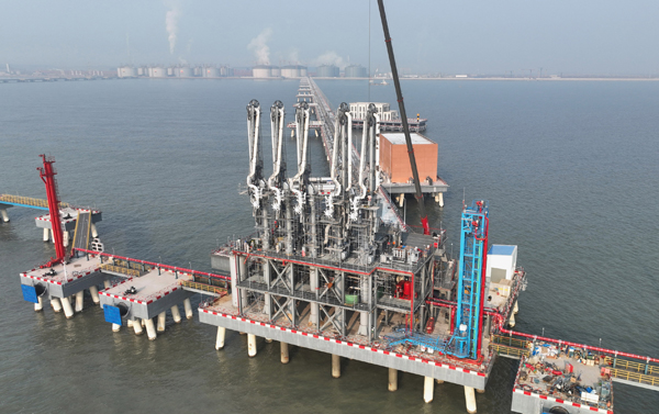2023年1月4日,工人在唐山市曹妃甸區(qū)新天LNG(液化天然氣)項目接收站碼頭施工(無人機照片)。