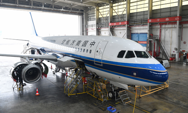 2023年1月5日,在位于海南省??谑械闹袊戏胶娇彰捞m基地機庫,工程師在對飛機進行檢修。