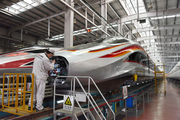 2023年1月4日,一名技術(shù)人員在查看“復(fù)興號”智能動車組。