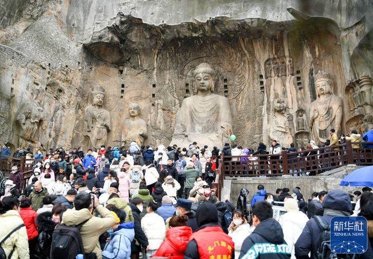 ↑1月26日,游客在河南省洛陽(yáng)市龍門(mén)石窟景區(qū)內(nèi)游覽。新華社發(fā)(張怡熙攝)