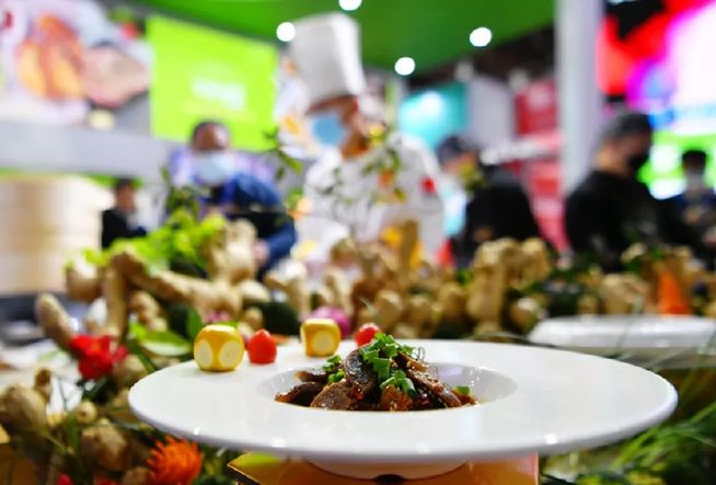 2021年12月2日,在2021中國預(yù)制菜產(chǎn)業(yè)大會暨展會現(xiàn)場,參展商展示一盤快熟菜品。新華社發(fā)
