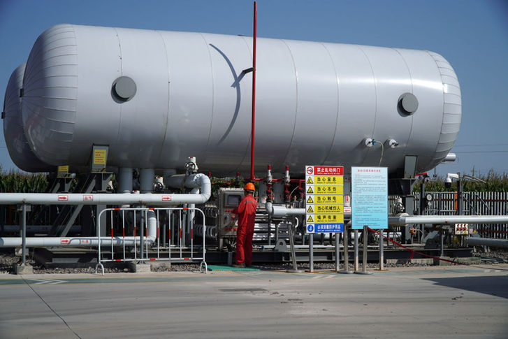 齊魯石化—?jiǎng)倮吞锇偃f噸級(jí)碳捕集、利用與封存項(xiàng)目10號(hào)注氣站,一名工作人員在檢查設(shè)備。記者 徐速繪 攝