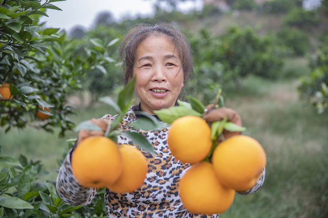近日,在重慶市璧山區(qū)廣普鎮(zhèn)坪中村,一位村民在果園內(nèi)展示自己采摘的臍橙。? 新華社記者 黃偉 攝