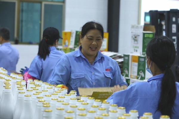 工人在椰汁飲品生產(chǎn)線上忙碌。(黎多江 攝)