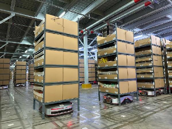 京東物流“地狼”智能機(jī)器人正在搬運(yùn)貨架。(新華社記者陳碧琪 攝)