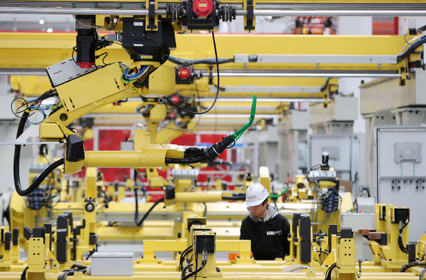 2月12日,德清縣雷甸鎮(zhèn)一家高空作業(yè)機械生產(chǎn)企業(yè)“未來工廠”車間,工人在調(diào)試智能化生產(chǎn)線。