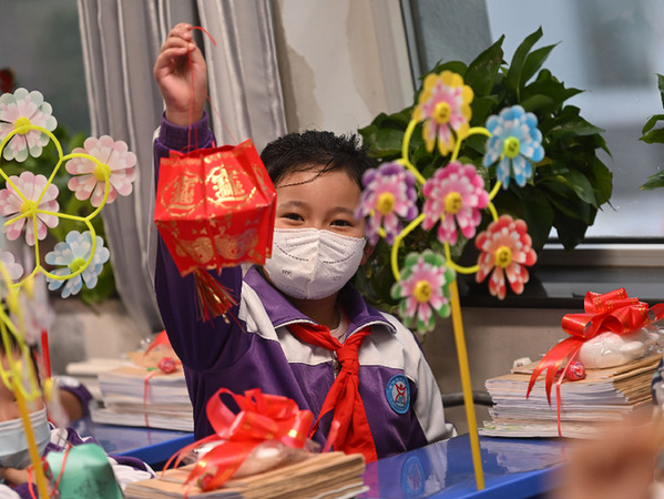 2月13日,在西寧市城西區(qū)文匯小學(xué),學(xué)生在展示自己的假期手工作業(yè)。當(dāng)日,青海省西寧市的小學(xué)生迎來開學(xué)首日,孩子們在降雪中開啟新學(xué)期。