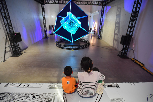 參觀者在“劉慈欣科幻漫畫宇宙主題展”的裸眼3D放映廳觀看節(jié)目。(資料照片)