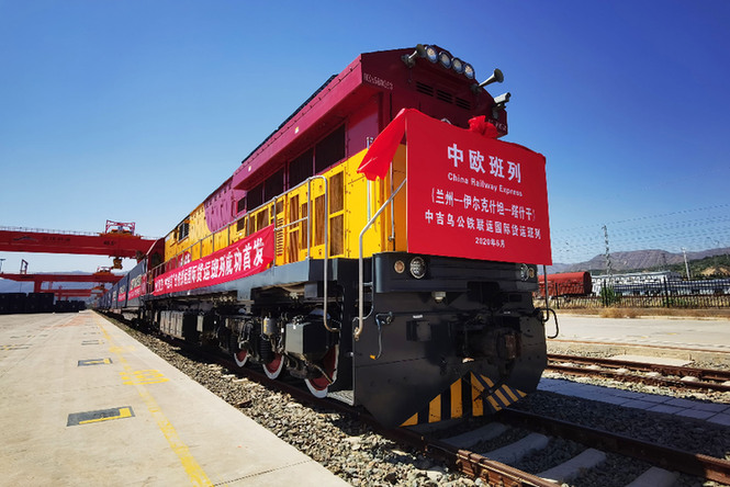 在甘肅(蘭州)國(guó)際陸港準(zhǔn)備發(fā)車的“中吉烏”公鐵聯(lián)運(yùn)國(guó)際貨運(yùn)班列。 新華社記者 范培珅 攝