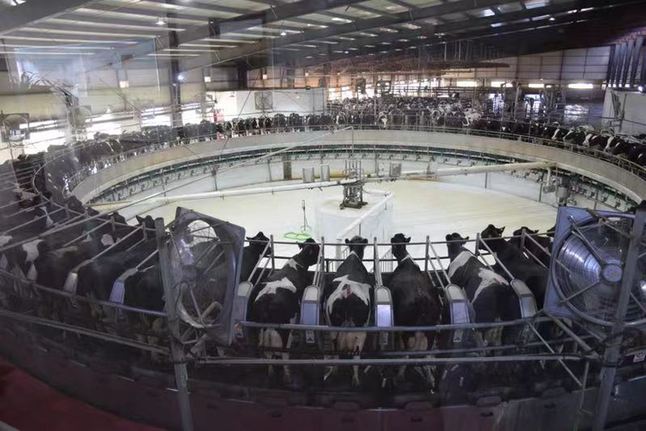 “一個9人班組,在3個小時左右的時間里能完成大約1900頭奶牛的取奶工作?!焙邶埥埣焉鷳B(tài)牧業(yè)有限公司副總經(jīng)理曹志達說,場區(qū)內(nèi)奶牛存欄量8500頭,日均產(chǎn)奶能達到150噸。