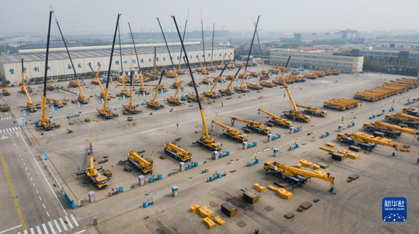 這是2019年4月4日在徐工集團徐州重型機械有限公司拍攝的調試中的起重機(無人機拍攝)。新華社記者 李響 攝