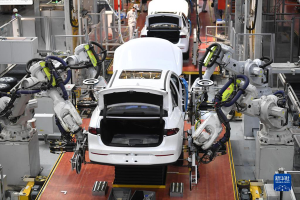 在廣州市番禺區(qū)的廣汽埃安新能源汽車股份有限公司總裝生產(chǎn)線,機器人手臂在安裝汽車輪胎(2023年2月24日攝)。新華社記者 鄧華 攝