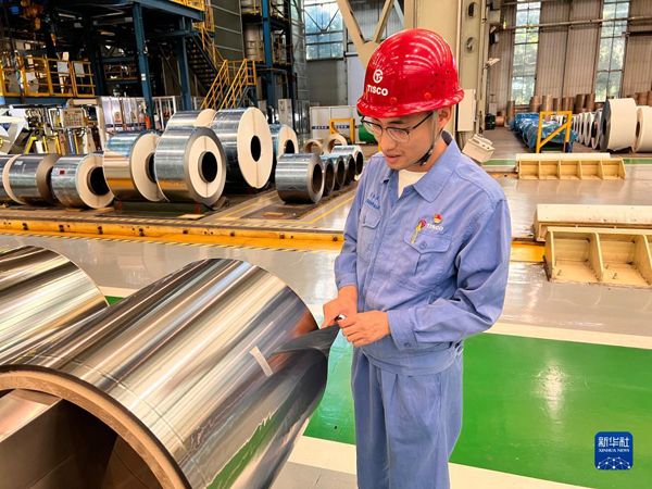 中國寶武太鋼精密帶鋼公司工作人員展示厚度為0.015毫米的“手撕鋼”(2022年8月25日攝)。新華社記者 張磊 攝