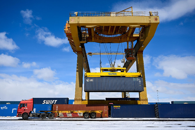 一輛貨車在滿洲里站貨運(yùn)車間集裝箱場裝卸集裝箱(3月15日攝)。
