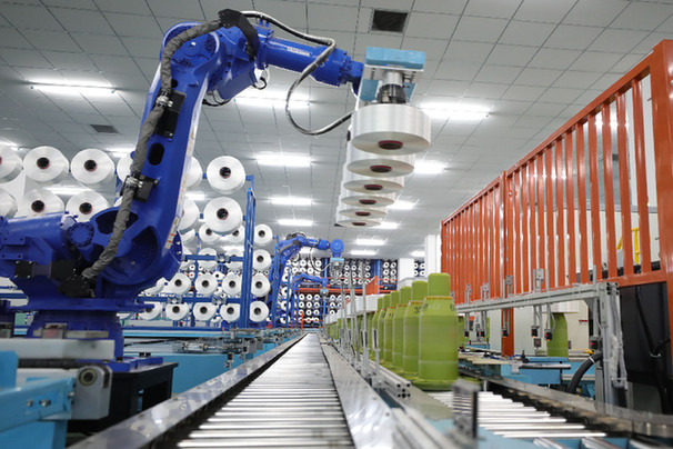 3月15日,在恒力(蘇州)產(chǎn)業(yè)園內(nèi)的高性能滌綸工業(yè)絲智能車間內(nèi),機(jī)械手臂將檢驗(yàn)合格的絲餅放上絲車,轉(zhuǎn)運(yùn)至智能立體倉庫。新華社記者 毛俊 攝