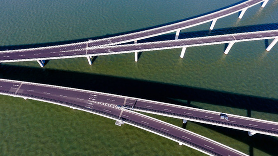 山東高速集團投資建設的青島膠州灣大橋(無人機)。記者 郭緒雷 攝