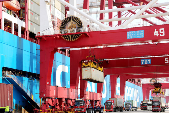 在山東港口青島港前灣聯(lián)合集裝箱碼頭,一艘貨輪在裝載貨物。新華社發(fā)(張進剛 攝)
