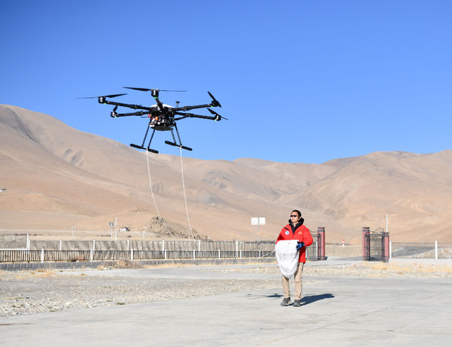 在中國科學(xué)院珠穆朗瑪大氣與環(huán)境綜合觀測研究站,科考隊員放飛無人機采集空氣樣本(5月10日攝)。