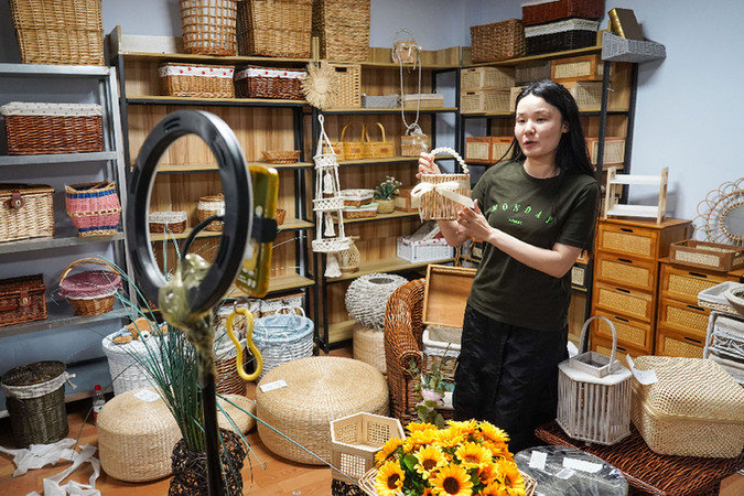 6月6日,臨沂金柳工藝品有限公司員工在電商平臺銷售柳編產(chǎn)品。
