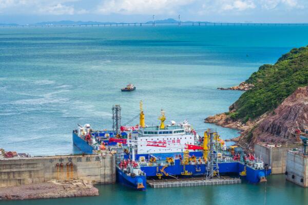 “一航津安1”號沉管運輸安裝一體船拖帶E23管節(jié)和最終接頭從珠海桂山島啟航,前往沉放水域(6月8日攝,無人機照片)。