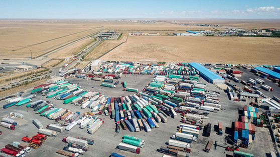 6月11日,二連浩特口岸旁的進出口物流園區(qū)中大量貨運卡車排隊準備出關(無人機照片)?!∮浾摺∨碓础z