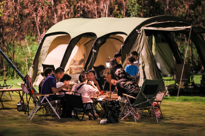游客在露營(yíng)地體驗(yàn)戶外娛樂。