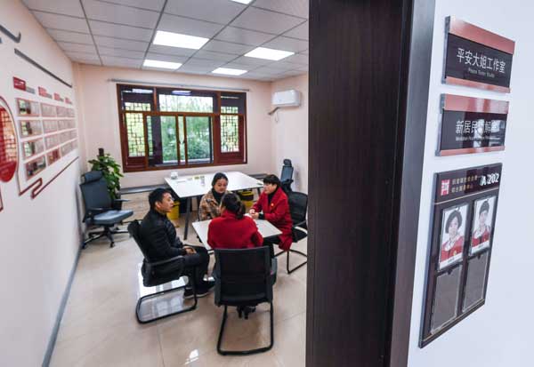 在浙江省湖州市織里鎮(zhèn)社會(huì)治理綜合服務(wù)中心調(diào)解室,“平安大姐”工作室的志愿者對(duì)一起糾紛進(jìn)行調(diào)解(2019年11月29日攝)。新華社記者 徐昱 攝