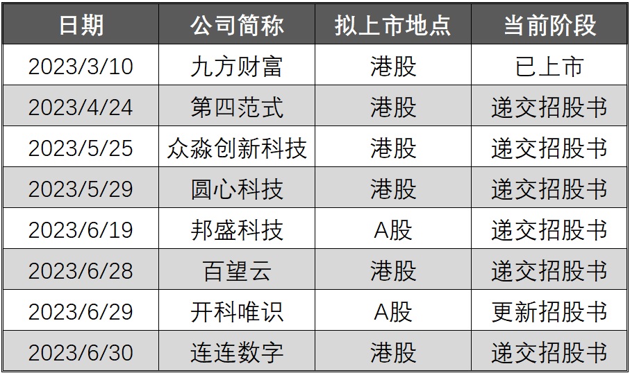 3月10日,在線投資決策解決方案提供商九方財(cái)富登陸港交所,打響了2023年國(guó)內(nèi)金融科技公司上市“頭炮”。公開(kāi)資料顯示,九方財(cái)富的控股股東為銀科控股,具有投顧牌照。隨后的4月24日,起步于金融行業(yè)AI服務(wù)的第四范式向港交所遞交了招股書(shū);5月25日,海爾旗下的數(shù)字化保險(xiǎn)代理服務(wù)及解決方案提供商眾淼創(chuàng)新科技向港交所遞交招股書(shū);5月29日,綜合醫(yī)療服務(wù)平臺(tái)圓心科技更新了港股招股書(shū),旗下的圓心惠保為保險(xiǎn)公司提供技術(shù)賦能服務(wù);6月28日,企業(yè)數(shù)字化解決方案提供商百望云向港交所遞交招股書(shū),公司通過(guò)百望云平臺(tái)提供財(cái)稅數(shù)字化及數(shù)據(jù)驅(qū)動(dòng)的智能解決方案;6月30日,數(shù)字支付及增值服務(wù)提供商連連數(shù)字首次向港交所遞表,該公司也是率先在全球范圍內(nèi)提供全面支付解決方案的中國(guó)公司之一。