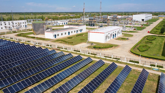 長慶油田第五采氣廠蘇里格天然氣第六處理廠廠區(qū)內(nèi)的光伏發(fā)電站。 記者 王鵬 攝