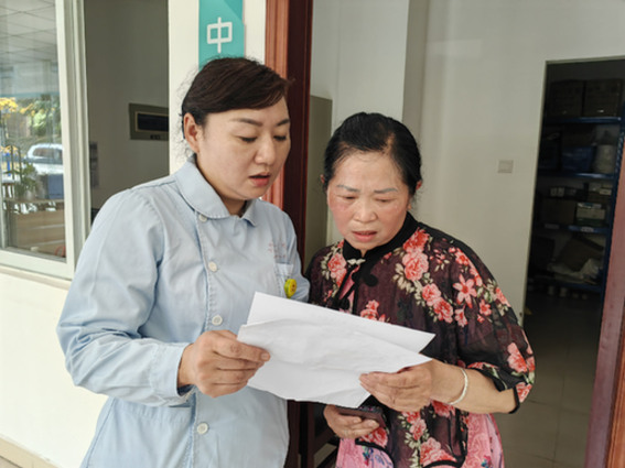 在成都回龍社區(qū)日間照料中心,成都八院護士喬雪蓮在給社區(qū)老人看體檢單?! ∮浾摺《〖t 攝