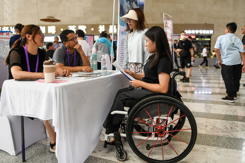 求職者在山東省殘疾人就業(yè)專場招聘會(huì)上咨詢崗位信息。資料照片