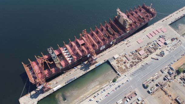 這是中船(天津)船舶制造有限公司廠區(qū)一艘已經(jīng)下水準(zhǔn)備交付的船舶(無(wú)人機(jī)照片)。記者 趙子碩 攝