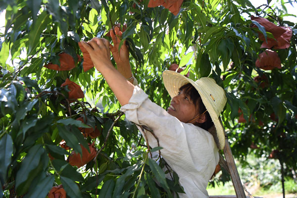 桃農(nóng)在炎陵縣下村鄉(xiāng)坳頭村采摘黃桃。新華社記者 薛宇舸 攝
