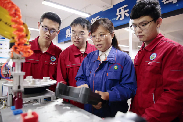 李粉霞在工業(yè)機(jī)器人技術(shù)實(shí)訓(xùn)中心講授工業(yè)機(jī)器人操作與編程課程。(學(xué)院供圖)