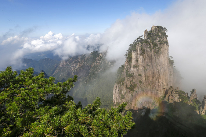 當日,雨后初霽的安徽省黃山風景區(qū)出現(xiàn)秋日迷人的藍天云海,在陽光的照耀下,罕見的“佛光”在云海中若隱若現(xiàn),與奇峰相映成趣。