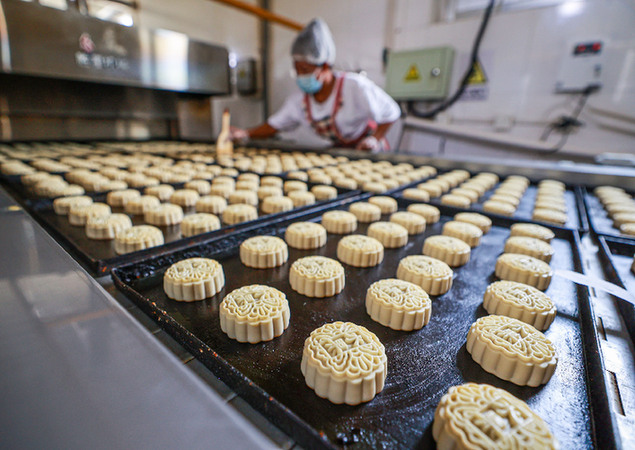 中秋節(jié)臨近,各地月餅加工企業(yè)忙著生產(chǎn)月餅,供應節(jié)日市場。新華社發(fā)(李信君 攝)