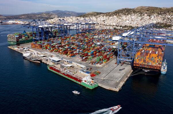 圖為2022年2月19日拍攝的希臘比雷埃夫斯港集裝箱3號(hào)碼頭(無人機(jī)照片)。作為“一帶一路”倡議的典范項(xiàng)目,希臘比雷埃夫斯港年貨物吞吐量增至500萬標(biāo)箱以上,躍升為歐洲第四大集裝箱港口、地中海領(lǐng)先集裝箱大港。新華社發(fā)(中遠(yuǎn)海運(yùn)港口比雷埃夫斯碼頭有限公司供圖)