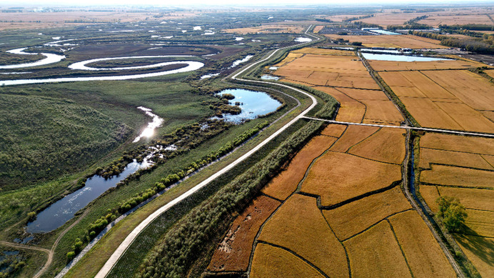 金秋十月,位于黑龍江省東部、松花江下游湯原縣的黑魚泡省級(jí)自然保護(hù)區(qū)內(nèi),聚集著成群結(jié)隊(duì)即將南下越冬的鳥類,濕地里的水草也從鮮綠變向暖黃色。隔著一條堤壩,比鄰的稻田泛著金燦燦的光,滿眼豐收景象。濕地與農(nóng)田相互映襯,構(gòu)成一幅和諧共生的美麗畫卷。
