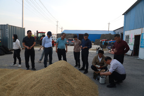 專家正在對(duì)宋廷周的水稻綠色低碳高產(chǎn)高效百畝示范區(qū)實(shí)割測(cè)產(chǎn)。劉茗 攝